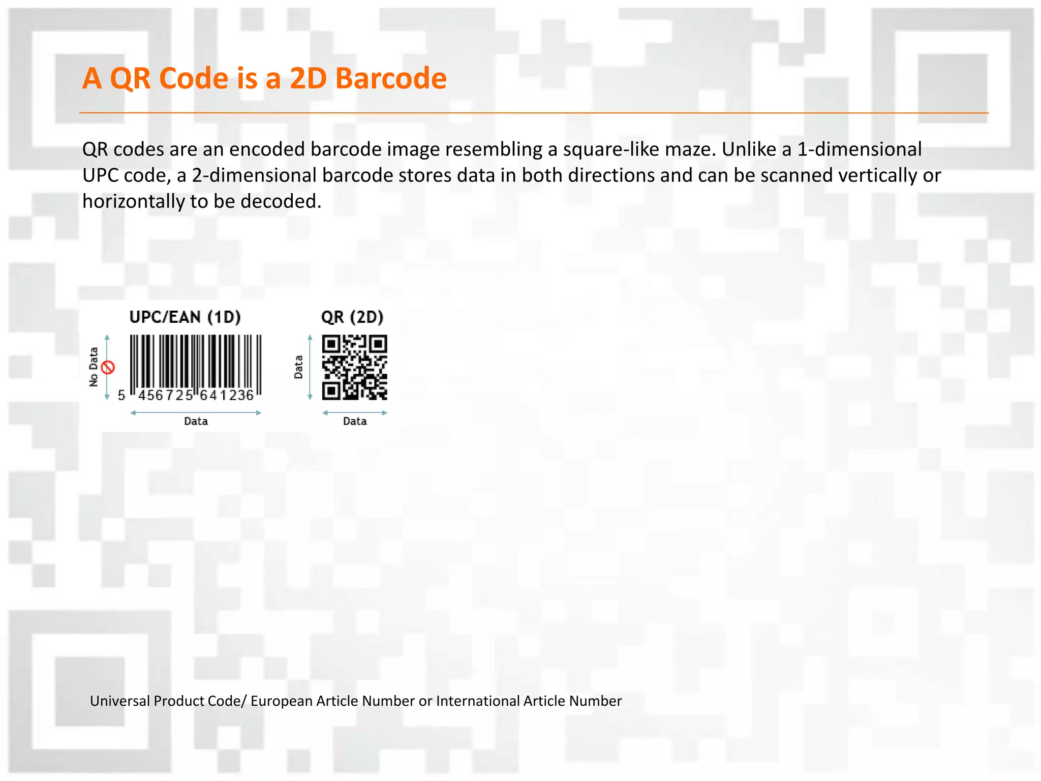 A QR code is a type of 2D barcode that can store text, contact information, URLs, or other data. Unlike a traditional 1D barcode, a QR code can be scanned from any direction and can store much more data. QR codes are commonly used to link to websites, share contact information, and more. While QR codes have been used by many companies to enrich marketing and customer experiences, their use may decline as near-field communication (NFC) technology becomes more widespread and integrated into devices. NFC allows contactless data sharing between devices in close proximity and has applications for payments, access cards, and loyalty programs. However, QR codes currently have advantages over NFC in terms of universality, low cost,