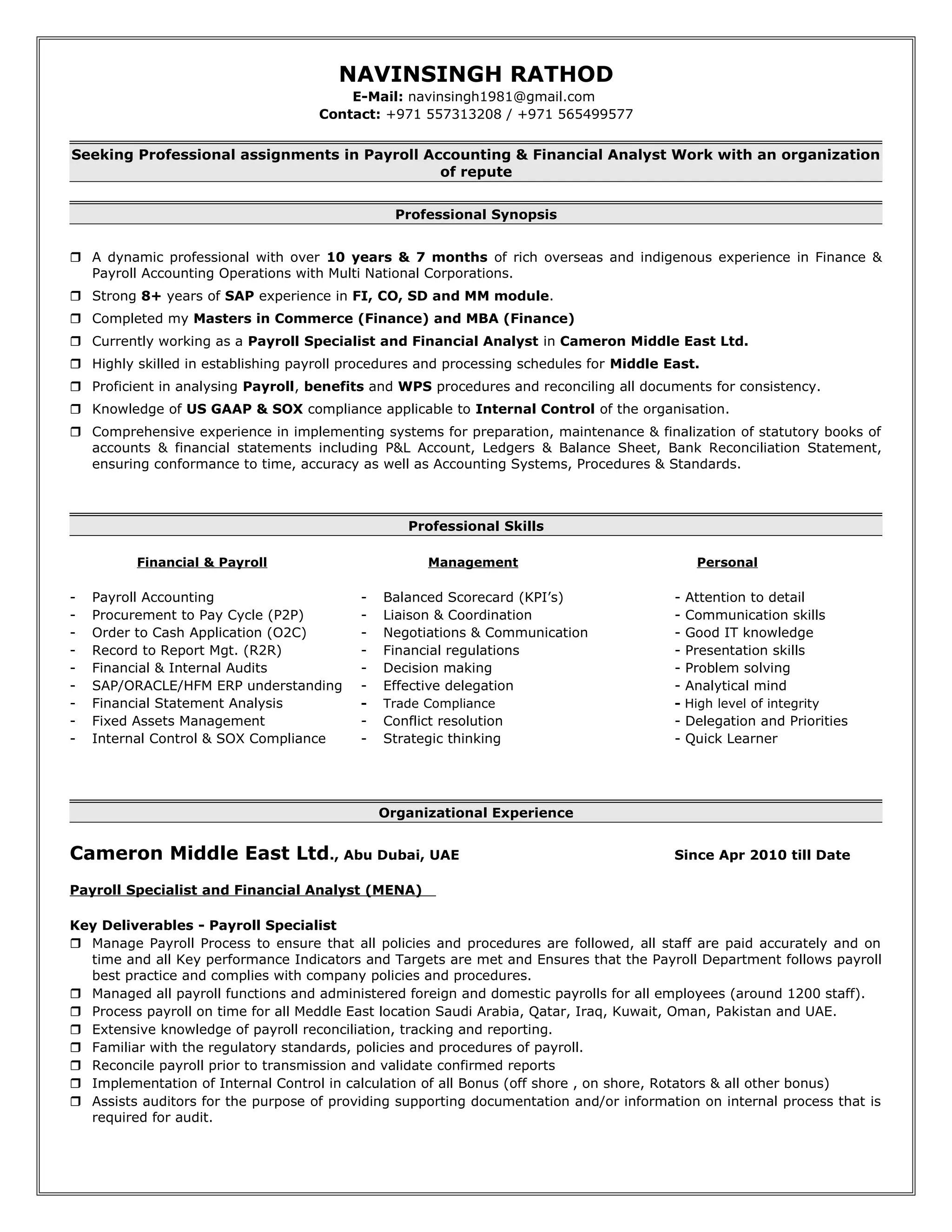 Navinsingh Rathod is seeking a position in payroll accounting or financial analysis with over 10 years of experience in finance and payroll operations. He has extensive experience managing payroll for over 1200 employees across multiple countries using SAP and reconciling financial statements. Currently he works as a payroll specialist and financial analyst for Cameron Middle East Ltd where he manages payroll processing, financial reporting, and cost analysis.