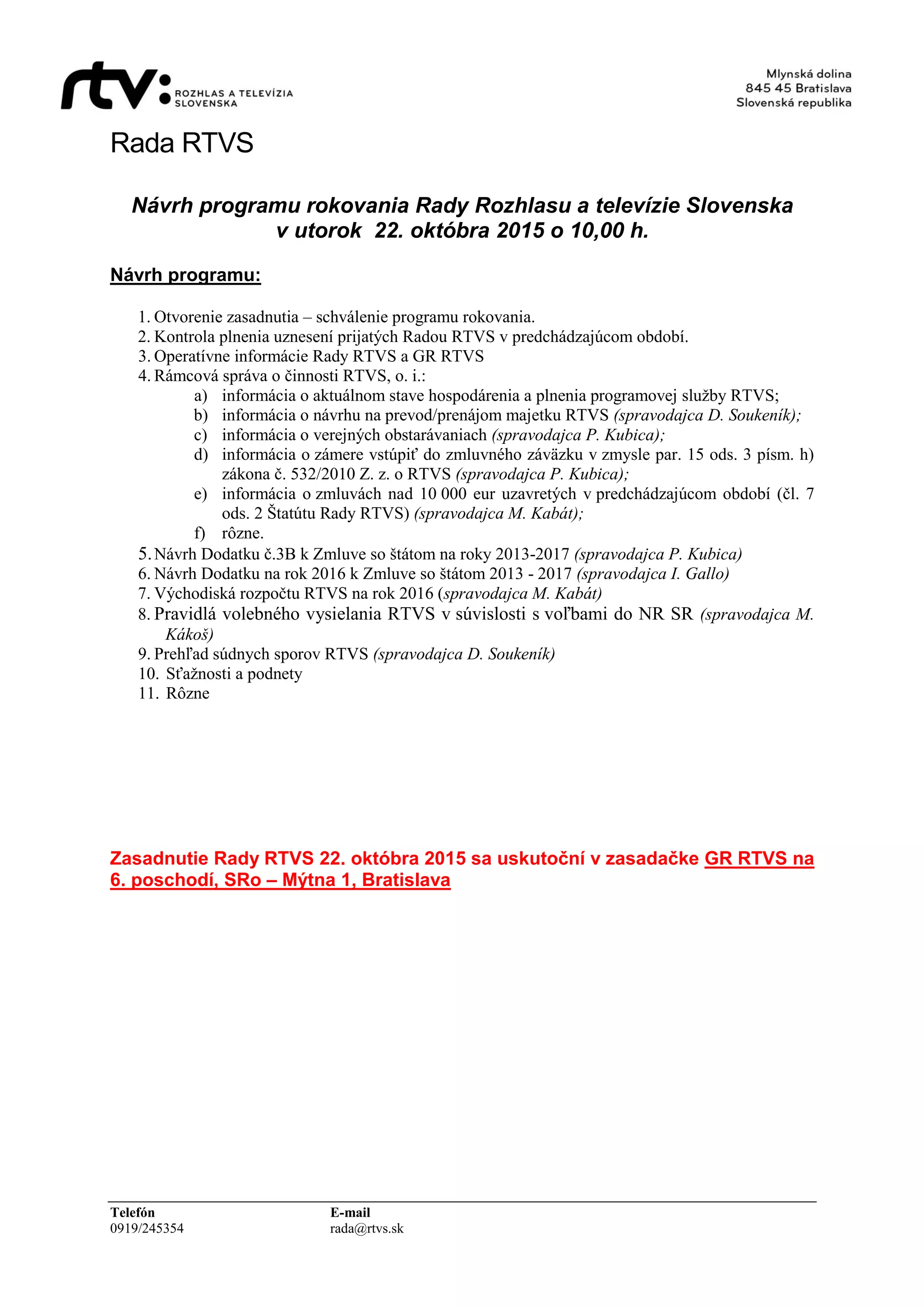 Zasadnutie Rady RTVS 22. októbra 2015 sa uskutoční v zasadačke GR RTVS na