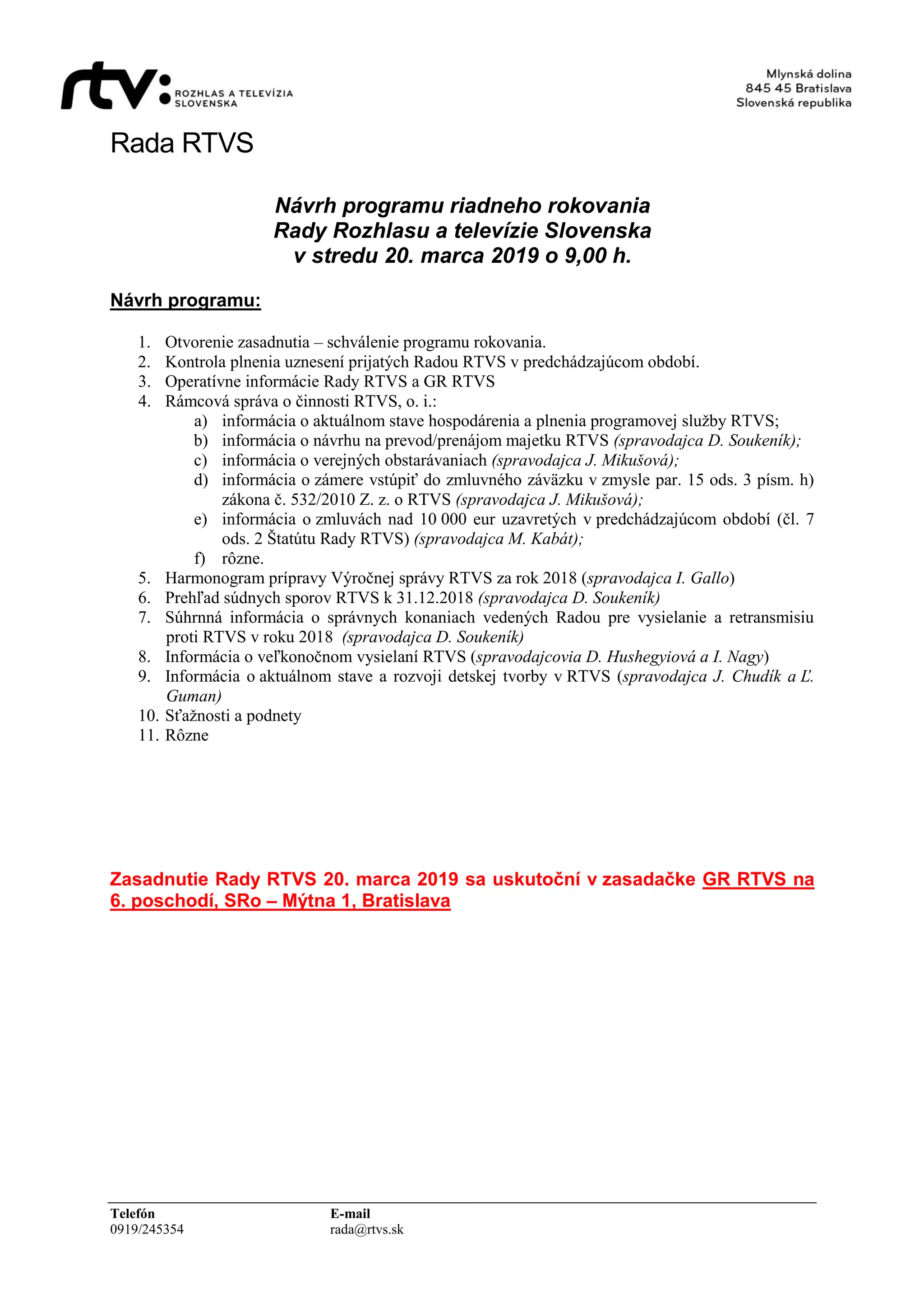Zasadnutie Rady RTVS 20. marca 2019 sa uskutoční v zasadačke GR RTVS na