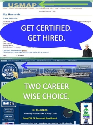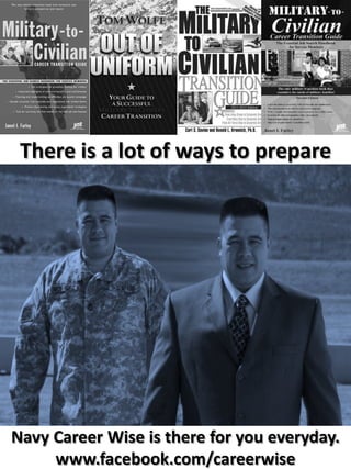 The document provides information about Navy Career Wise, a Facebook page that offers career counseling resources for sailors, veterans, and military families. It discusses the various types of career-related information provided on the page from A to Z, including advancement, benefits, career development, education, and more. It encourages connecting with the page to access tools and advice to help with career goals like advancement.