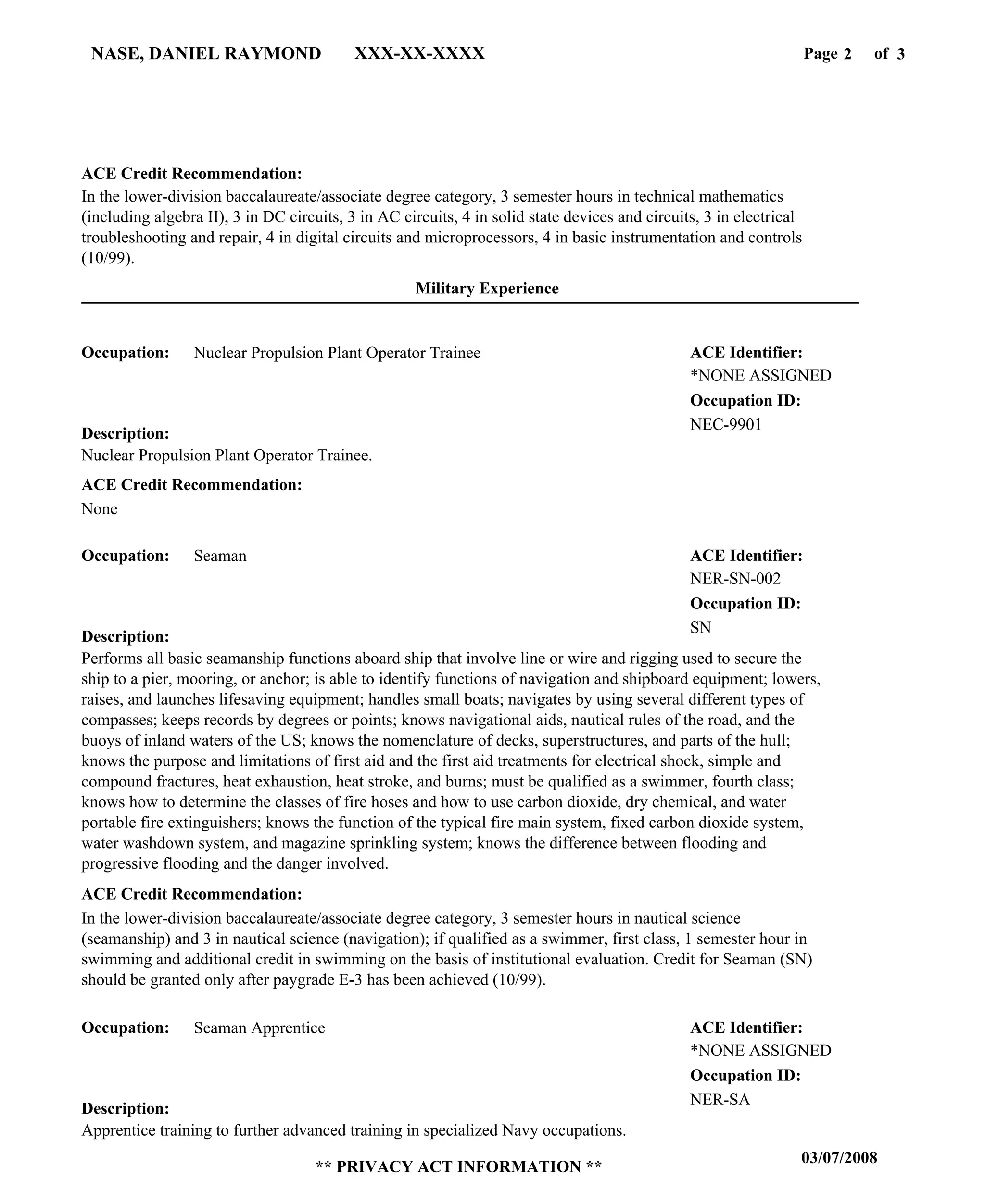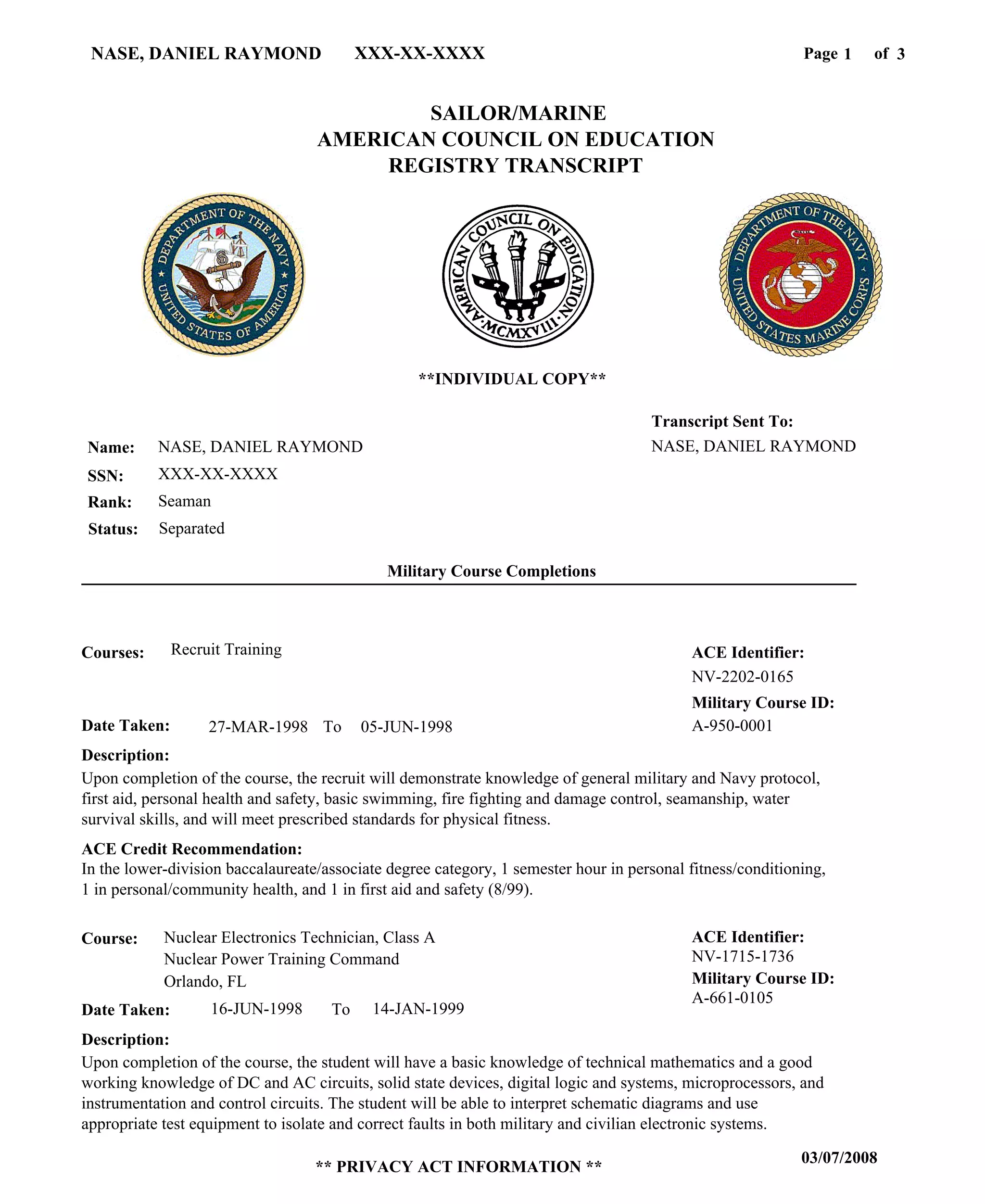 NASE, DANIEL RAYMOND completed Nuclear Electronics Technician, Class A training on January 14, 1999. The course provided training in topics such as AC circuits, basic instrumentation and controls, DC circuits, digital circuits and microprocessors, electrical troubleshooting and repair, and solid state devices and circuits. He also completed Recruit Training on June 5, 1998 which covered topics like first aid and safety, personal fitness/conditioning, and personal/community health. Additionally, as a Seaman from September 1, 1999 he gained experience in subjects including nautical science, navigation, seamanship, and swimming.