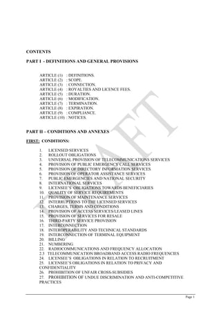 This document is a translation of a telecommunications license granted to the Omani-Qatari Telecommunications Company (Nawras) to install and operate fixed public telecommunications systems and provide telecommunications services in Oman. The license contains standard definitions, general provisions regarding fees and obligations, conditions for services, interconnection, quality of service, and more. It grants Nawras the right to provide various telecom services, including basic voice, data, international, and broadband access using fixed and wireless networks, subject to regulations on interconnection, consumer protection, and other industry standards.
