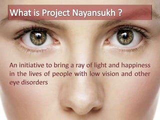 Over 40 million people worldwide are blind or have low vision that cannot be treated, with the number expected to double by 2020. Most visually impaired individuals live in developing countries like India, where nearly 45 million people have vision impairments but less than 15% have access to vision enhancement services. With training and low vision aids, visually impaired people can perform independently at home and work, but many lack awareness of or access to these services.