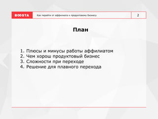 Документ обсуждает переход от аффилиатного бизнеса к продуктовому, выделяя плюсы и минусы каждого направления. Описываются сложности, с которыми сталкивается бизнес при переходе, а также предлагаются решения для плавного перехода, такие как использование white label и консалтинговых услуг. В документе также подчеркивается важность контроля процессов и потенциальной финансовой выгоды в продуктовом бизнесе.