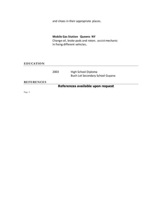 This resume is for Nazeem M. Sheriff, who is seeking a rewarding position utilizing their training and experience. They have skills in typing, MS Office, data entry, and internet use. Their qualifications include excellent working relationships with others, the ability to work independently and complete numerous tasks, and being reliable, honest, hardworking, and motivated to learn. Their previous work includes being a shipper responsible for shipping, receiving, and inventories at Limited Edition For Her in New York and working in customer service, warehouses, and as an assistant mechanic.