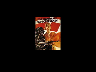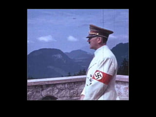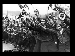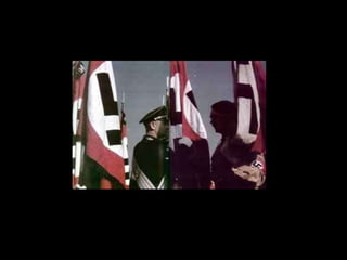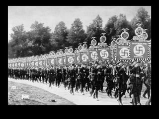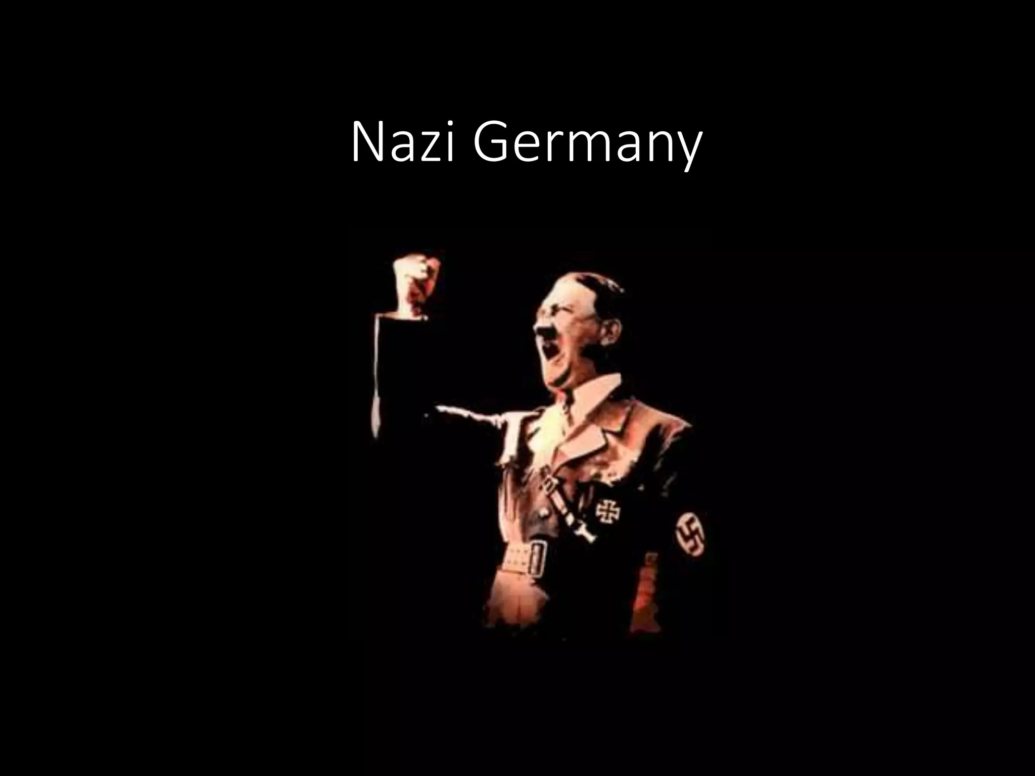 The document provides an overview of the rise of Nazi Germany beginning with Adolf Hitler's early life and political activities following World War 1. It describes key events that allowed the Nazis to rise to power such as the 1923 Beer Hall Putsch, Hitler's time in prison writing Mein Kampf, and the Great Depression which increased support for the Nazi party. The Nazis capitalized on fears of communism and economic instability to gain a majority in the Reichstag in 1933, allowing Hitler to consolidate power and transform Germany into a totalitarian Nazi state by 1935 with the Nuremberg Laws.