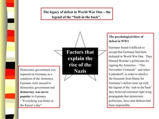 The document lists several factors that helped explain the rise of the Nazis in Germany: