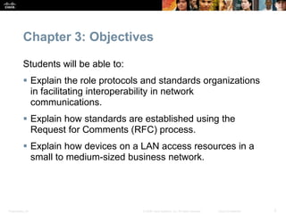 This document summarizes a chapter about network protocols and communications. It discusses how protocols establish communication rules and standards organizations develop protocols through processes like RFCs. It also describes how data is encapsulated when moving through networks and OSI and TCP/IP models for conceptualizing network layers. Specific topics covered include protocol suites, addressing, data encapsulation, accessing local and remote network resources, and standards bodies.
