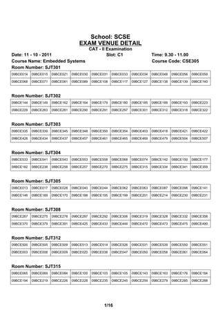 The document provides details of exam venues and room assignments for various courses on October 11, 2011 at SCSE. It lists the room numbers and student IDs assigned to each room for the CAT-II examination for courses including Embedded Systems, Modern Physics, and Computer Graphics between 9:30-11:00 am. Over 30 rooms are listed with assignments of 10-20 students per room for the exams during this time slot.