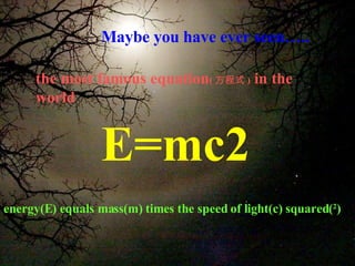 Albert Einstein was a German-born physicist and inventor who developed the theory of relativity and E=mc2 equation. He was awarded the Nobel Prize in Physics in 1921. Einstein is considered one of the most influential scientists of the 20th century. He was passionate about physics from a young age and devoted his life to scientific study and discovery despite challenges with the educational system and his careers. Einstein's theories revolutionized how we understand space, time, mass, and energy and transformed modern physics.