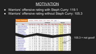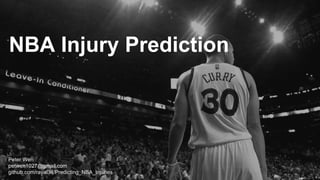 The document discusses an attempt to predict NBA player injuries using statistical modeling. It collected player statistics over a three-week period to predict the likelihood of injury in the next three games. The model was able to predict injuries with an AUC score of 0.549. Important predictive features included a player's running speed, distance ran, and hustle statistics like charges drawn and balls recovered, which may indicate increased injury risk. The author proposes further improving the model by investigating additional hustle stats.