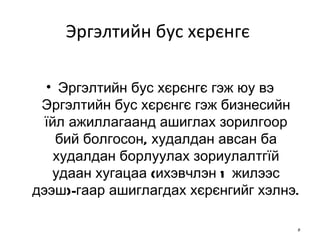 Эргэлтийн бус хєрєнгє Эргэлтийн бус хєрєнгє гэж юу вэ Эргэлтийн бус хєрєнгє гэж бизнесийн їйл ажиллагаанд ашиглах зорилгоор бий болгосон, худалдан авсан ба худалдан борлуулах зориулалтгїй удаан хугацаа (ихэвчлэн 1 жилээс дээш)-гаар ашиглагдах хєрєнгийг хэлнэ. - 3.