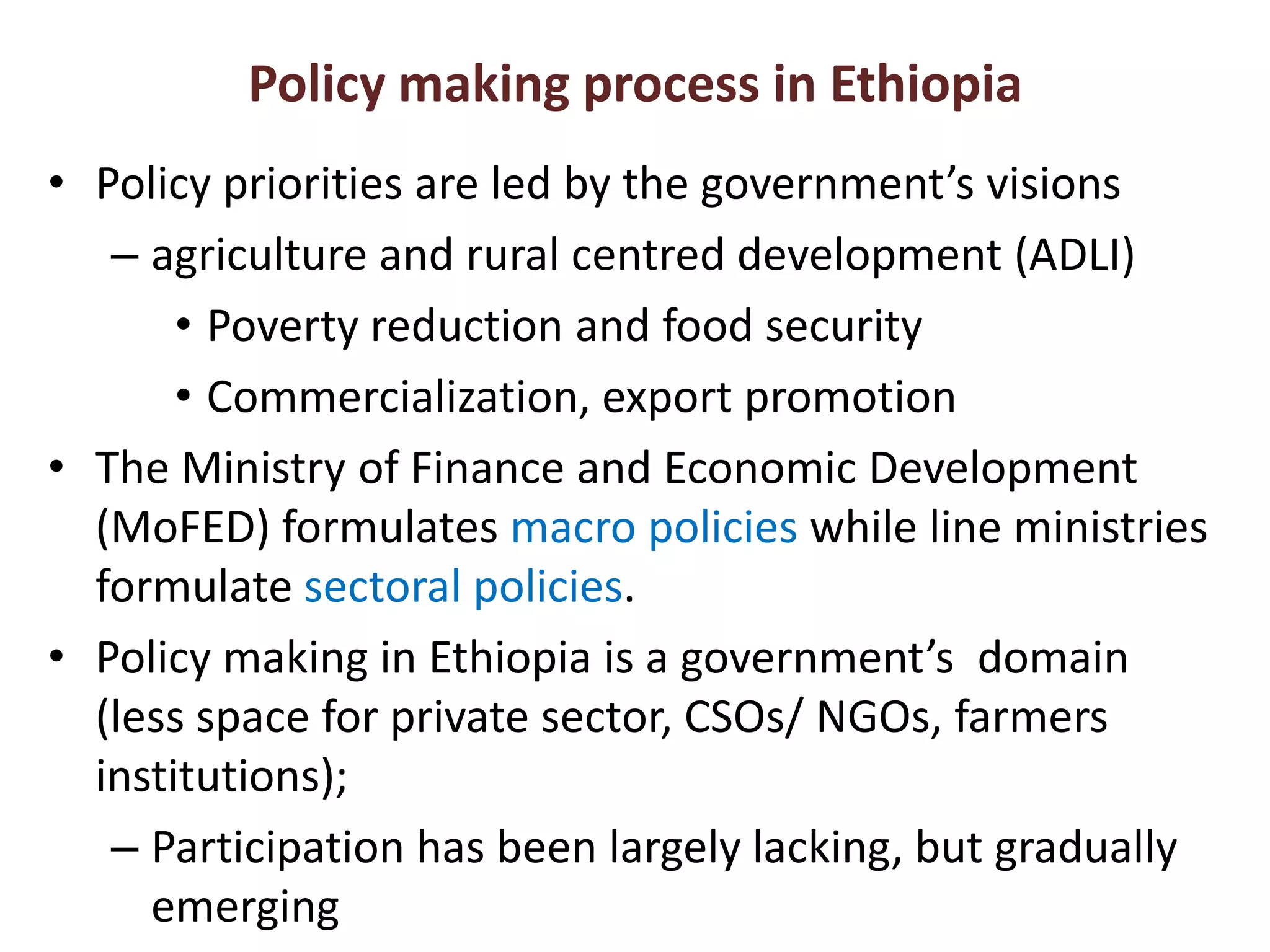 The document discusses the policy-making process in Ethiopia, highlighting the government's predominant role and the lack of participation from various stakeholders. It identifies constraints such as insufficient data, analytical skills, and roles of external influences, while also emphasizing the importance of effective communication and building networks to enhance policy relevance and credibility. The authors propose strategies to engage with policymakers and improve the flow of research evidence to support evidence-based decision-making.