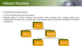 This document provides an analysis of India's non-banking financial company (NBFC) sector. It discusses the industry structure, nature of business, and differences between NBFCs and banks. NBFCs complement the banking system and account for 12.7% of the financial system's total assets. The document also analyzes NBFCs' sources and uses of funds, financial performance metrics like return on assets and non-performing assets, and recent regulatory changes affecting the sector. Overall, it presents an overview of the NBFC industry in India.