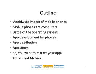 - The mobile app market is dominated by Apple's iOS and Google's Android operating systems, though RIM, Microsoft and others still have shares of the market.