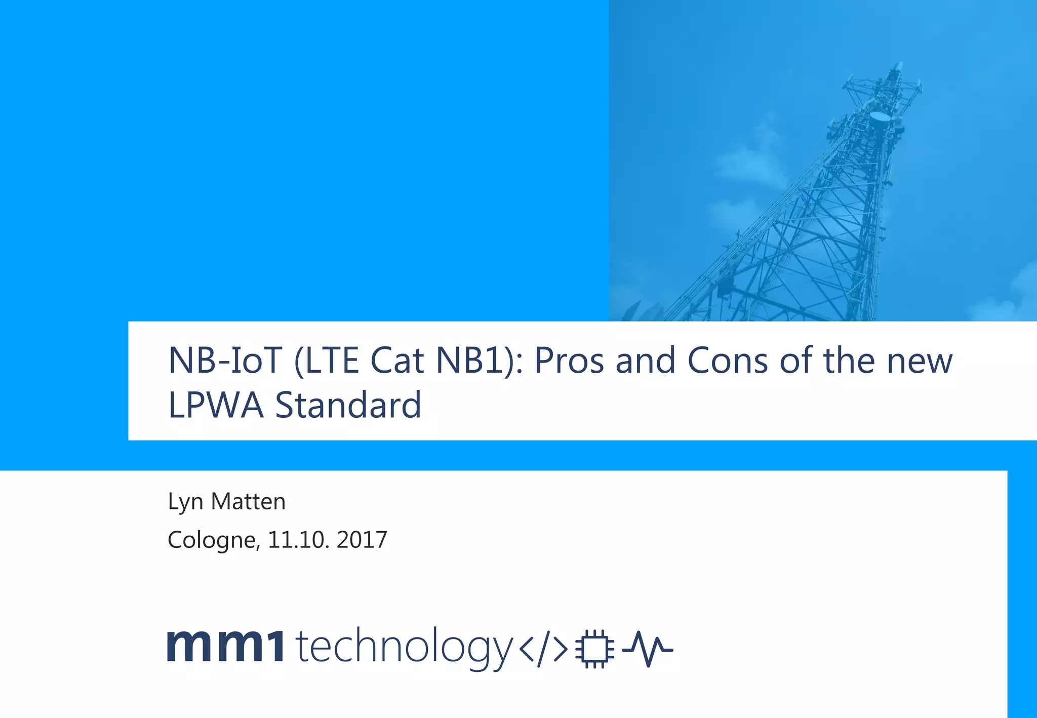 This document provides an overview and comparison of different Low Power Wide Area Network (LPWA) technologies, focusing on Narrowband IoT (NB-IoT). It discusses how NB-IoT is a 3GPP standardized LPWA technology that was developed for IoT applications. It can support a wide range of use cases but is not suitable for time-critical or data-intensive applications. The document also outlines some of the pros and cons of the NB-IoT standard.