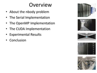 The document presents an overview of a parallel n-body code implementation, comparing serial, OpenMP, and CUDA approaches. Key insights include the computational challenges of the n-body problem, with emphasis on efficiency improvements in force calculations and memory usage in GPU architecture. Experimental results demonstrate significant cost reductions achieved with the CUDA implementation compared to serial and OpenMP versions.