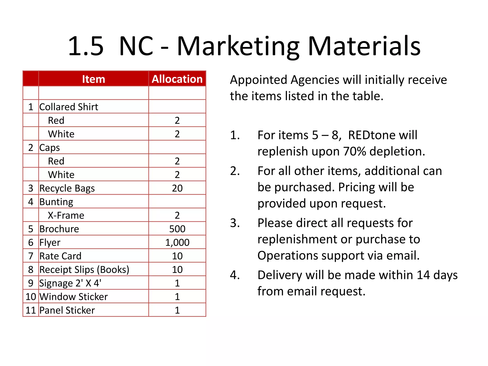 Appointed agencies will initially receive marketing materials based on the items and allocations listed in the table. For items 5-8, REDtone will replenish the agency upon 70% depletion by sending a replenishment request via email to operations support. For other items, additional materials can be purchased by sending a purchase request to operations support, and pricing will be provided upon request. Delivery of replenishment or purchased materials will be made within 14 days of the email request.