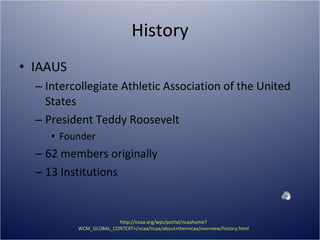 The NCAA was founded in 1906 and has grown to oversee championships and establish guidelines for athletics programs at over 1000 member institutions. It addresses challenges such as academic integrity, health and safety, and maintains core values of learning, balance, character and fairness. The organization has faced public scrutiny over issues like sports gambling and works to promote reforms related to areas like academics and drug testing.