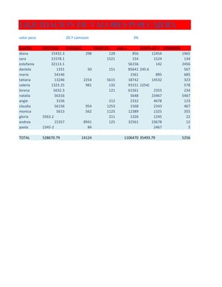 POR CAJERA valor peso 20.7 comision 3% CAJERO diana sara estefania daniela maria tatiana valeria lorena natalia angie claudia monica gloria andrea paola EFECTIVO CHEQUES TARJETAS vta$ u 15432.3 298 128 21578.1 1521 32113.1 1331 50 151 54146 13246 2254 5615 1323.25 981 132 5632.3 121 56316 3156 212 56156 954 1253 5613 562 1125 5563.2 211 15357 8941 125 2345-2 84 TOTAL 528670.79 14124 VENTA U$ S COMISION 856 12454 1965 154 1524 134 56156 142 2456 85641 245.6 567 1561 895 685 18742 14532 323 93151 1254} 578 61561 2355 234 5648 23467 5467 2332 4678 123 1568 2343 467 12389 1325 355 1326 1245 22 32561 23678 12 2467 3 1106470 35493.79 5256