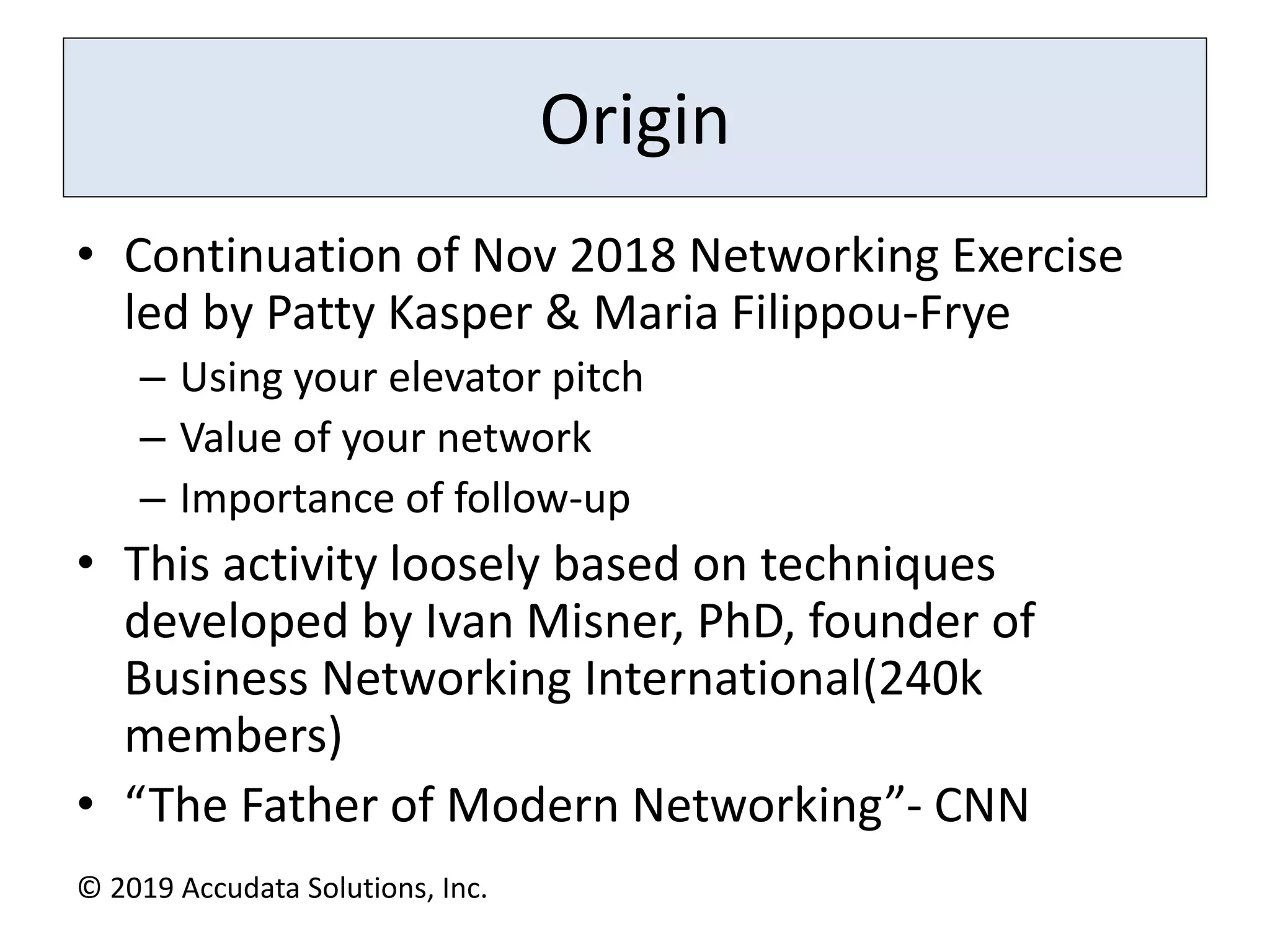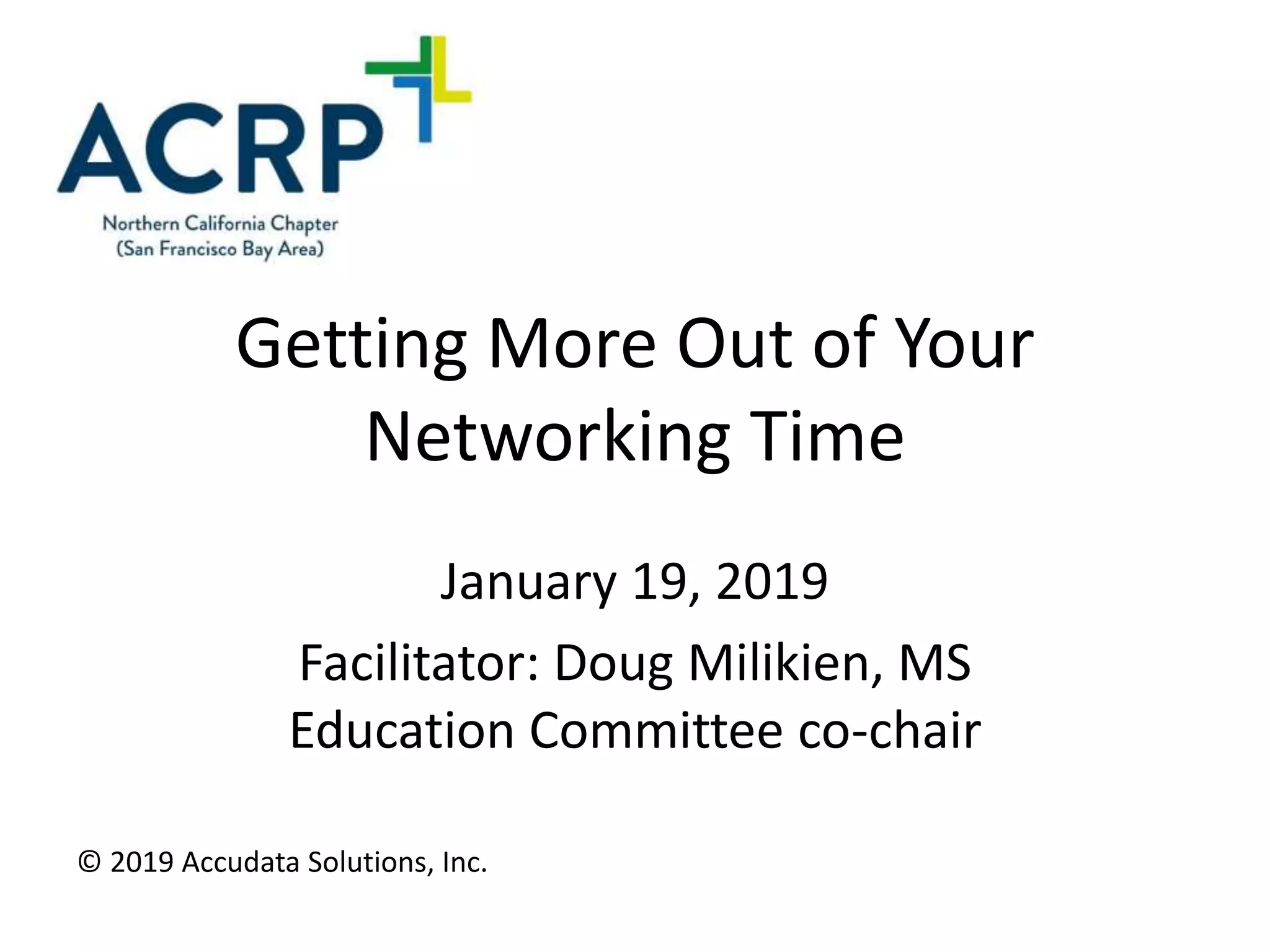 The document provides strategies for maximizing networking opportunities, emphasizing the importance of having clear objectives and being prepared. Key principles include asking engaging questions, offering help, limiting conversations to 10 minutes, and consistently following up with contacts after networking events. It also includes sample questions to facilitate meaningful conversations at networking functions.
