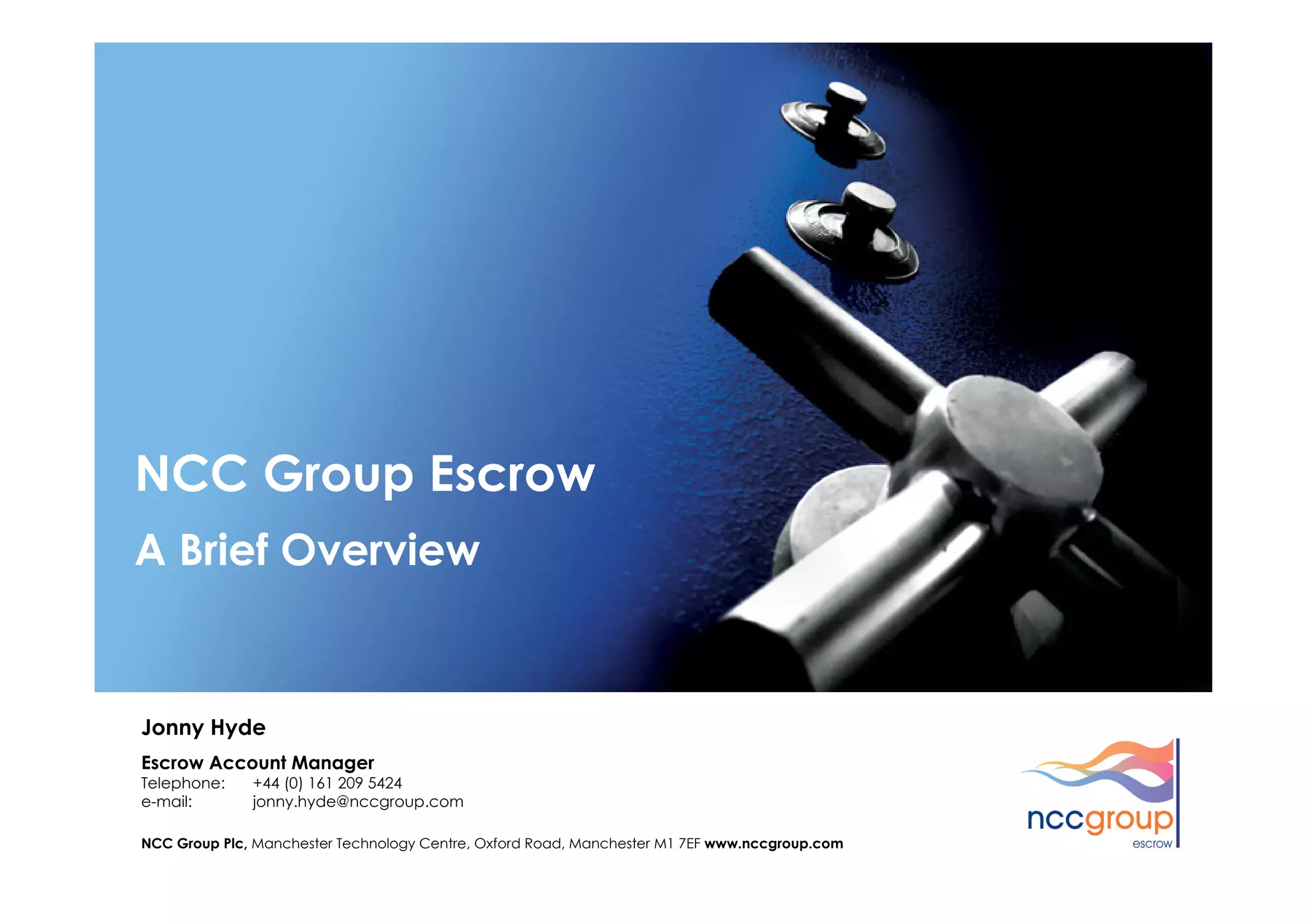 NCC Group is a leading independent IT assurance provider with over 30 years of experience providing escrow services. They protect over 5,000 software suppliers and have over 2,000 multi-licensee escrow agreements in place. Escrow provides a simple and effective way to minimize the risk of depending on third parties for business critical software and services by holding important materials like source code in escrow to ensure continued access and support. NCC Group offers various escrow and verification solutions tailored to different software licensing models and business needs.