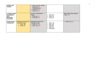 This document outlines the key assessments and data collection plan for an early childhood education program. It includes 6 standards that are assessed through various courses and projects. Formative and summative assessments are used to evaluate students' understanding of child development, building family relationships, observing and assessing children, using effective teaching approaches, developing curricula, and becoming a professional. Key assessments like classroom observations, child studies, teaching skills reflections, and philosophy papers are collected a minimum of 3 times for each standard through 8 core courses at the introductory, intermediate, and application levels. The goal is to formally collect data on each assessment across multiple courses to track student learning and skill acquisition.