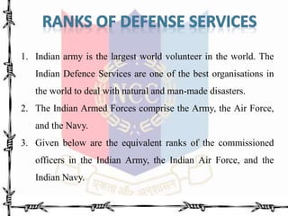 The document discusses the Indian Army, highlighting its status as the largest volunteer force globally and its role in managing disasters. It details the organizational structure of the Indian Armed Forces, including ranks of commissioned officers across the Army, Air Force, and Navy. Additionally, various camps conducted by the NCC (National Cadet Corps) and their associated activities are outlined.