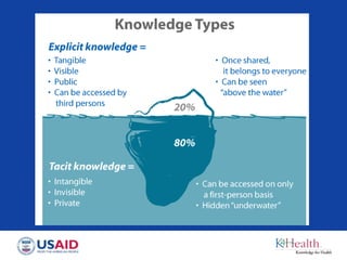 The document outlines a webinar presentation on sharing best practices in public health, facilitated by Lisa Mwaikambo, on March 30, 2016. It emphasizes the importance of knowledge management (KM) in translating tacit knowledge into explicit forms, supporting decision-making, and improving health outcomes. The webinar includes polls and discussions on KM processes, best practice identification, and resources for further learning.