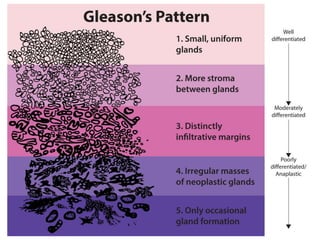 The document describes a Gleason grade grouping system used to classify prostate cancer based on biopsy results. It assigns prostate cancers a grade from 1 to 5 based on their Gleason scores, with lower grades indicating less aggressive cancers and higher grades indicating more aggressive cancers likely to spread.