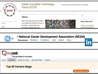 This document provides an overview of creating and maintaining a career services blog on WordPress.com. It discusses setting up a WordPress account, publishing blog posts, determining writing goals and content ideas. Part 1 covers creating a WordPress site and publishing a basic blog post. Part 2 focuses on developing a blogging voice, generating post topics aligned with other career bloggers, and engaging with the career blogging community.