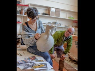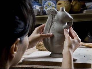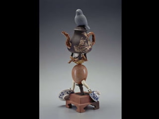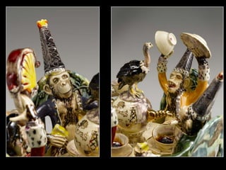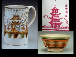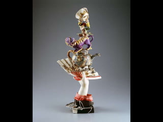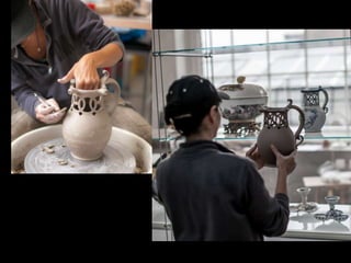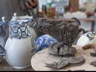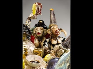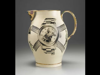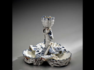 The document traces the history of ceramics from ancient artifacts like the Venus of Dolní Věstonice to contemporary works displayed in various museums. It highlights significant pieces such as Chinese porcelain from Jamestown and different pottery techniques spanning several centuries and regions. Additionally, it features works from notable artists and collections, emphasizing the evolution and cultural significance of ceramics.