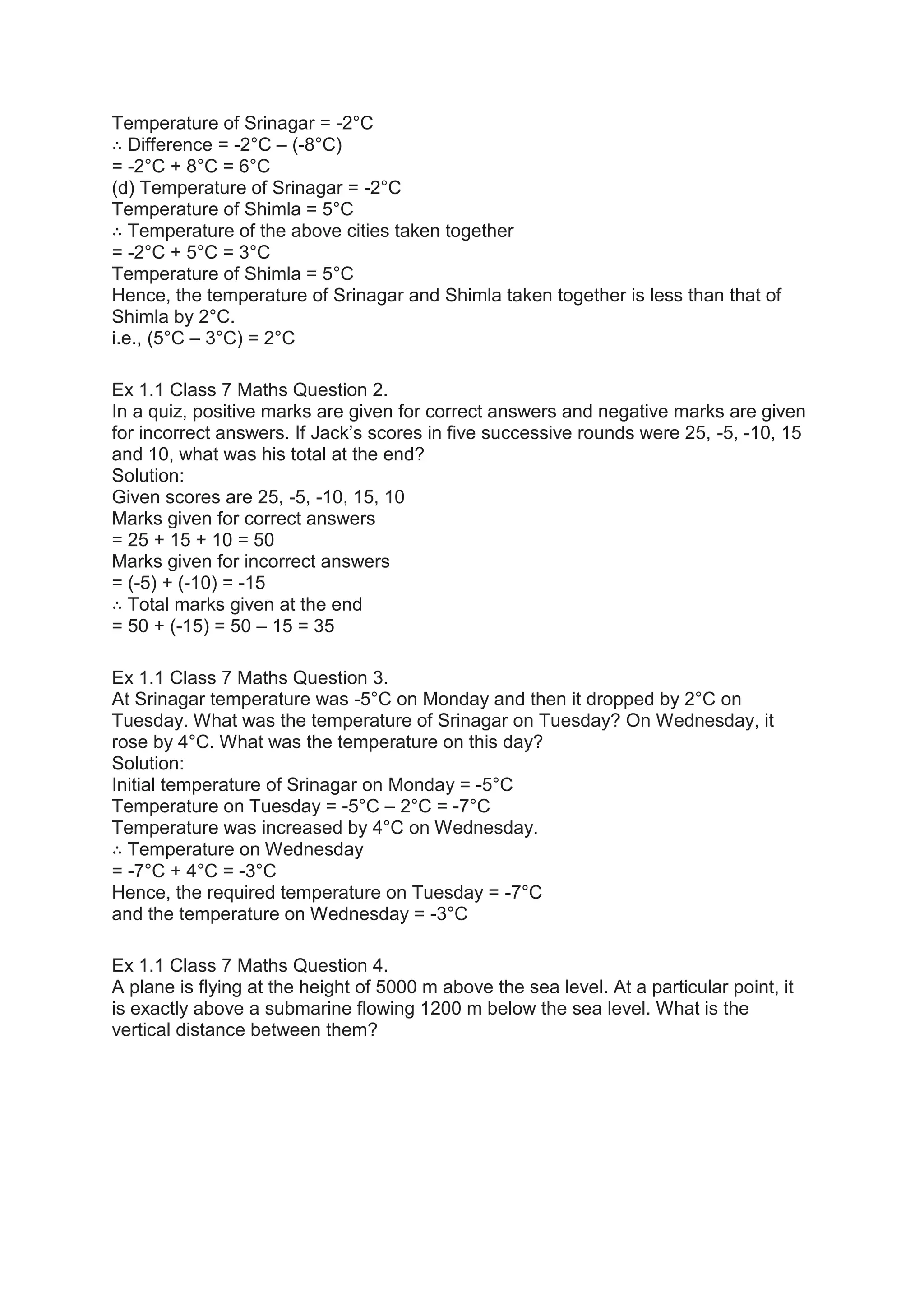 This document contains solutions to 10 questions from NCERT Class 7 Maths Chapter 1 on integers. The questions involve calculating temperatures differences, scores in a quiz, balances in bank accounts after deposits and withdrawals, and representing vertical distances and movements up and down steps on a number line. The solutions provide the step-by-step workings and answers to each question in detail.