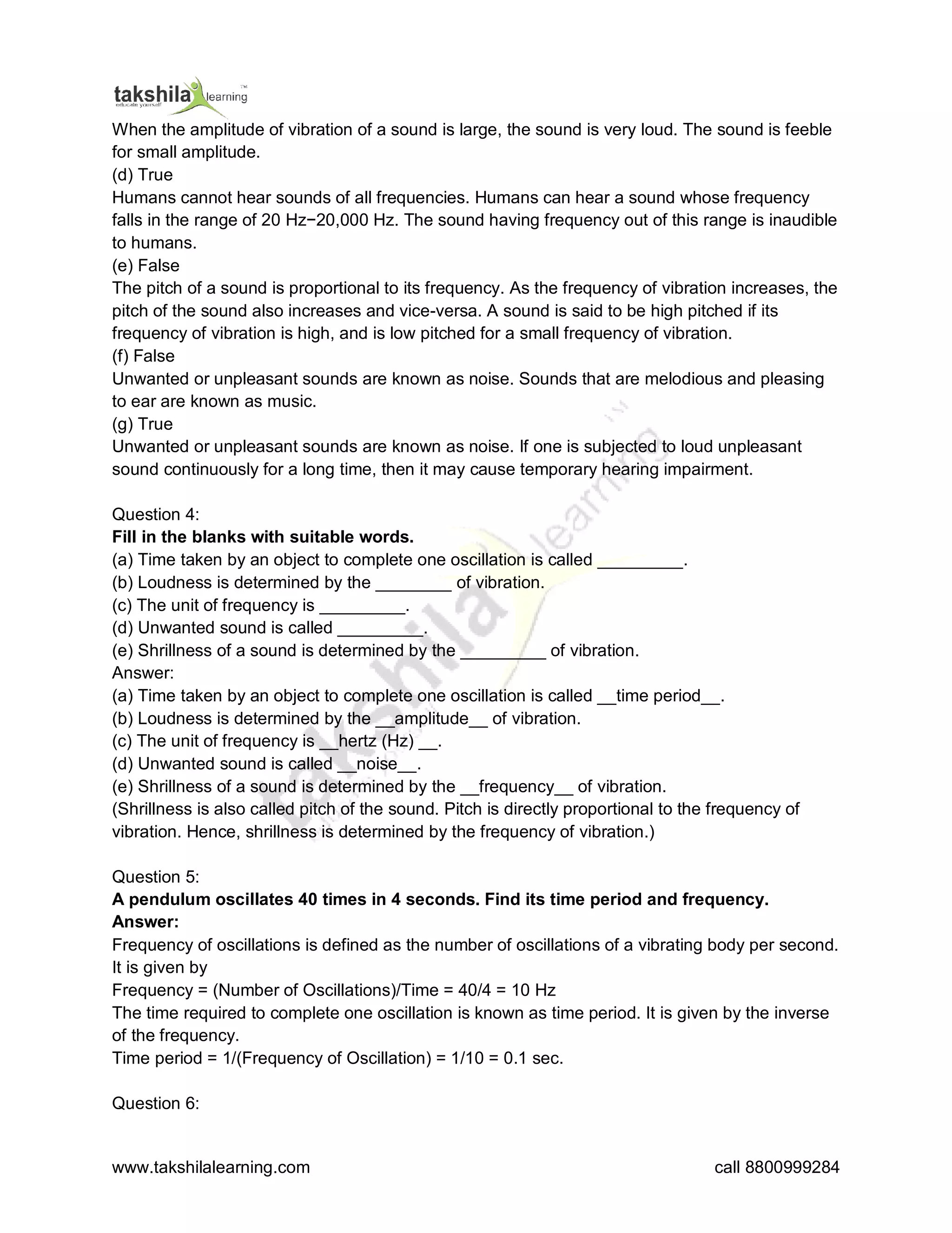 The document contains questions and answers about sound from a science textbook. It discusses topics like how sound travels through solids, liquids and gases; the frequency ranges of different voices; true/false statements about sound; definitions of terms like time period and frequency; examples of calculating time period and frequency from given oscillations; and parts of instruments that vibrate to produce sound.