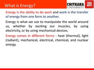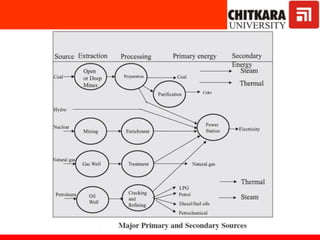 This document provides an introduction to non-conventional energy sources. It defines various types of energy sources such as primary and secondary, commercial and non-commercial, and renewable and non-renewable. India's energy scenario is discussed, noting its rapid economic growth places high demand on energy resources. Coal, petroleum and natural gas make up a large portion of India's energy production and consumption currently, though renewable sources such as solar, wind and biomass have significant untapped potential.
