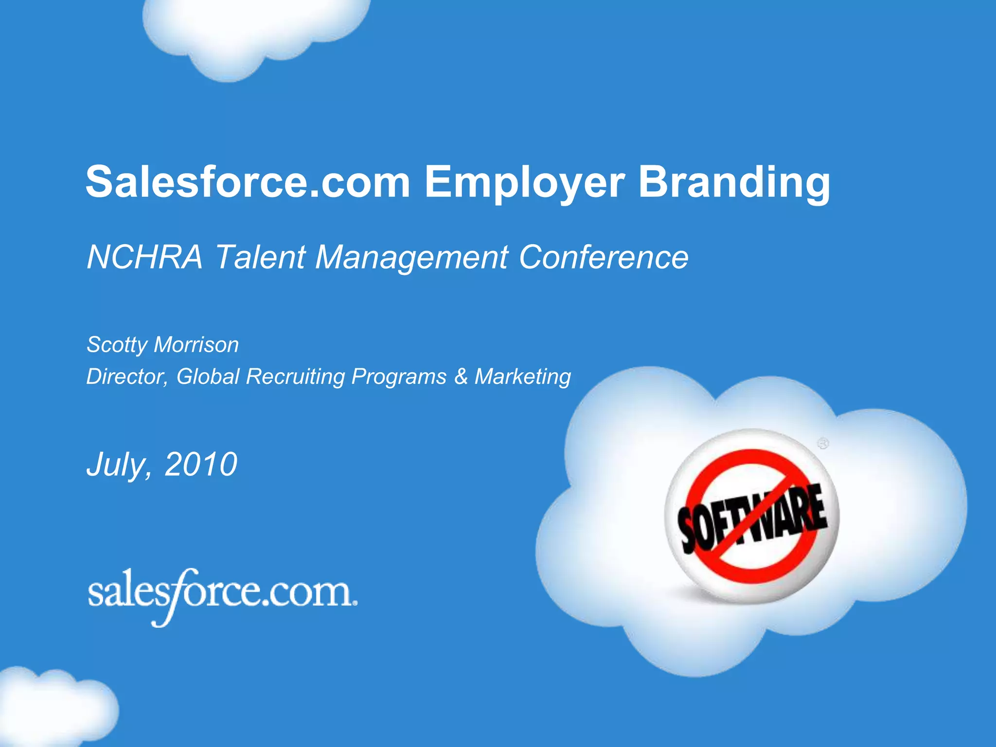 Salesforce.com focuses on employer branding through interactive experiences that allow customers and potential employees to engage with the company culture. They emphasize building their brand through online communities and social networks rather than traditional products, and measure their success through web analytics and participation in online conversations about the company.