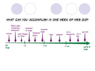 This document provides guidance for museums looking to get involved in web 2.0 technologies and platforms. It outlines some common fears and challenges such as loss of control and maintenance issues. However, it also discusses the opportunities for micro-audiences, interactivity, and bridging distances. The document then gives considerations for how to approach various aspects of a web 2.0 project such as audience, purpose, ownership, editing, and community participation. It emphasizes the importance of planning for maintenance and having an "escape route" if the project does not go as intended.