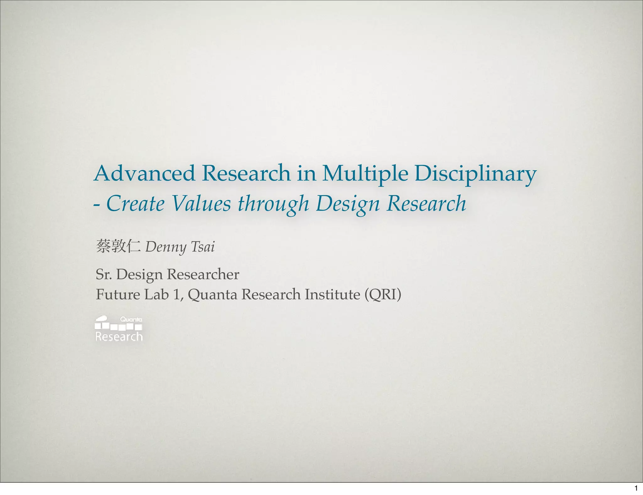 This document provides an introduction to the Quanta Research Institute (QRI) and its design team. It discusses QRI's research initiatives in technology and products. It then describes the design team's focus on user research, interaction design, and design values like aesthetics and usability. The document presents a model for interaction design studies that considers aspects like cognition, experience, and mediation between humans and objects. It emphasizes the paradigm shift with interaction design and designing prototypes to solve real problems through agile loops of production. The goal is to ask the right questions and do the right things to meet user needs over 10 years, align with technology changes over 2 years, and envision a vision over 100 years.
