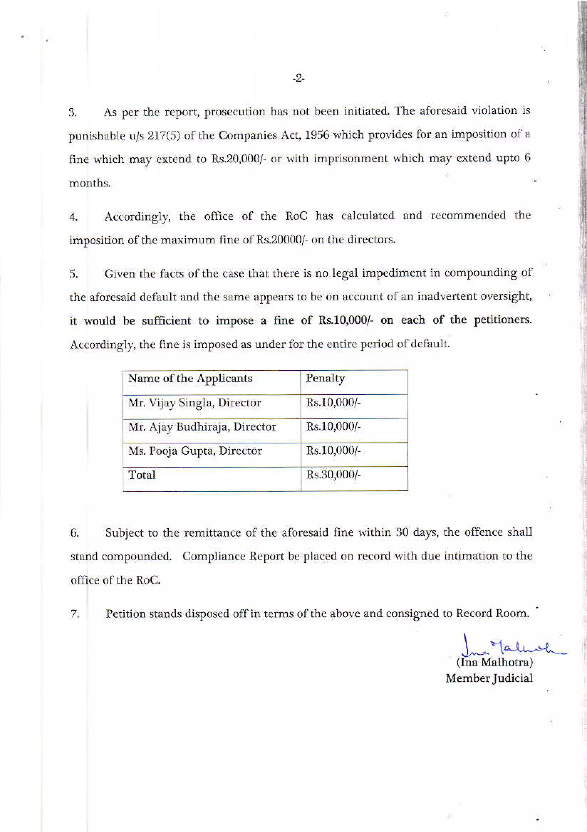3. The petitioner stated this was an unintentional omission. The Tribunal imposed a fine of Rs. 10,000 each on the three directors totaling Rs. 30,000 to compound the offense, subject to payment within 30 days.