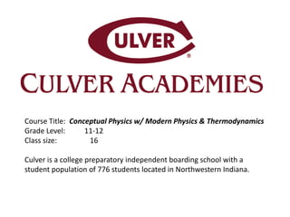 The document outlines a conceptual physics course offered at Culver Academies for grades 11-12, focusing on scaling from macro to nano levels. It includes details on the course structure, topics covered such as e/m waves and atomic theory, and student feedback highlighting engagement with AFM demonstrations. The document also emphasizes successful learning outcomes and the integration of computer modeling for enhanced visualization of nanoscopic phenomena.