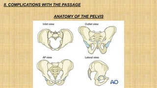 This document discusses various complications that can occur with the passage of the baby during birth due to issues with the mother's pelvis or birth canal. It describes how narrowing or contractions of the inlet, midpelvis, or outlet can cause cephalopelvic disproportion. It also discusses other potential issues like anomalies of the placenta such as placenta succenturiata which could lead to hemorrhage if lobes are retained, and vasa previa which involves blood vessels crossing the cervix and can cause bleeding with dilation. External cephalic version and trial of labor are mentioned as potential approaches to addressing some of these complications.