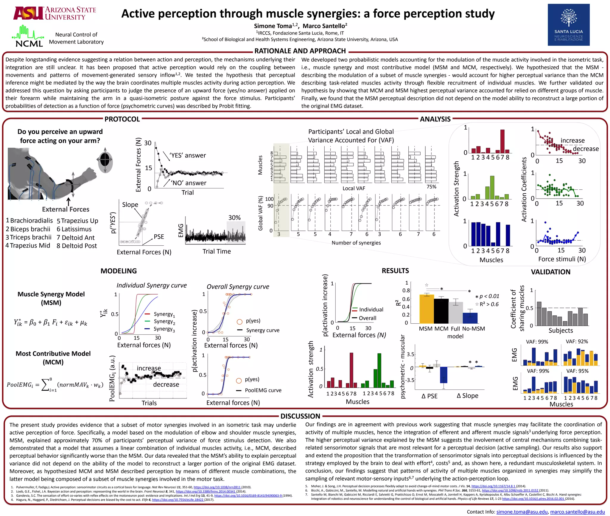 The document describes a study that tested whether muscle synergies underlie active perception of force. Participants judged if an upward force was applied to their forearm while maintaining posture. A model based on modulation of elbow and shoulder muscle synergies (MSM) explained about 70% of participants' ability to perceive force, compared to 50% for a model of individual muscle activity. The findings provide evidence that motor synergies involved in the task underlie force perception, suggesting synergies simplify sampling of relevant sensory inputs.