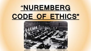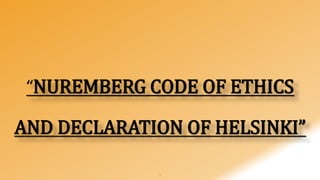 The document discusses the Nuremberg Code and Declaration of Helsinki, which established ethical guidelines for human experimentation. It summarizes that the Nuremberg Code was created in 1947 by American judges after Nazi doctors were tried for experiments on concentration camp prisoners. The Code established 10 standards for ethical human experimentation, including requiring voluntary consent. The Declaration of Helsinki was developed later in 1964 by the World Medical Association and built upon the Nuremberg Code by providing additional ethical principles for clinical research involving human subjects to ensure their rights and safety.
