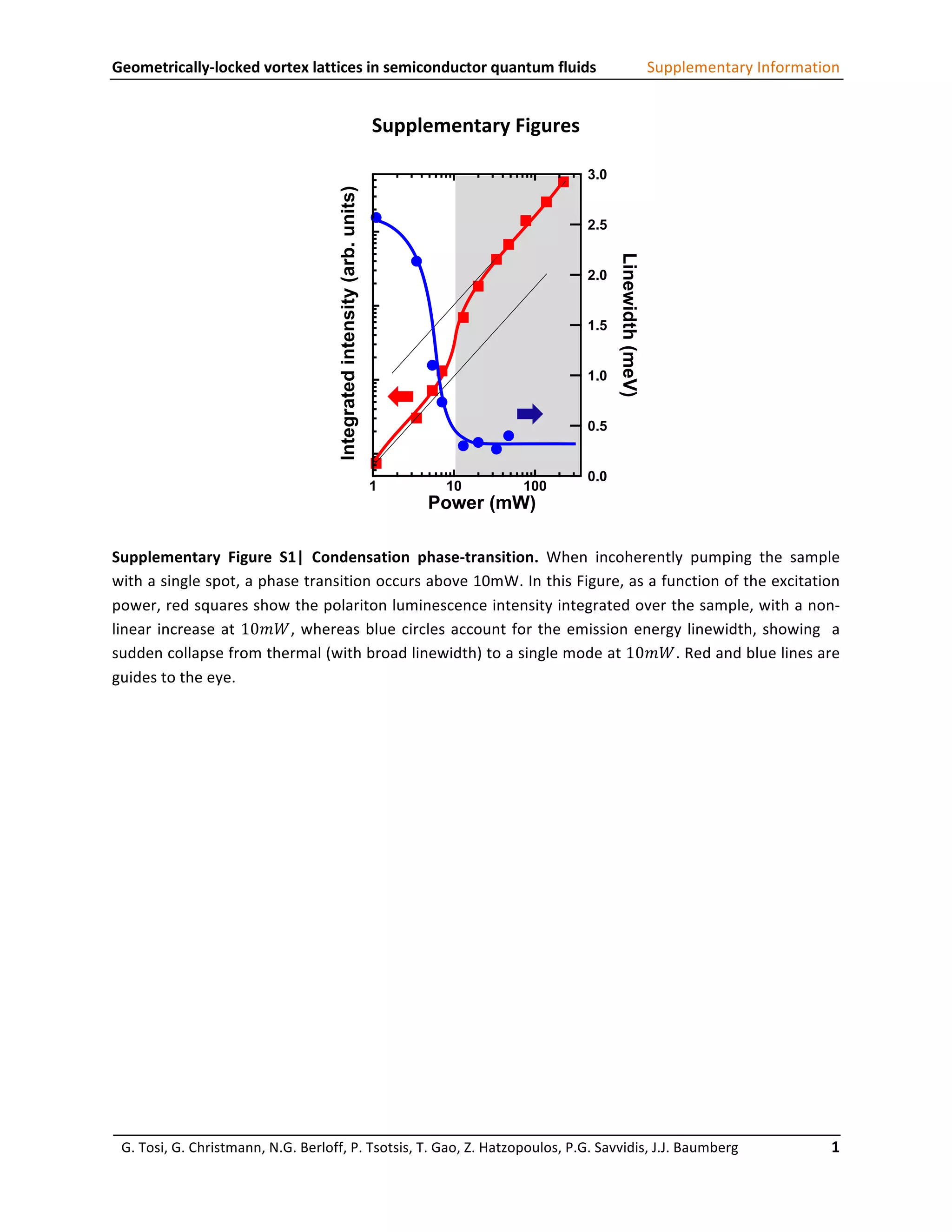 This document provides supplementary information to support a study on geometrically-locked vortex lattices in semiconductor quantum fluids. Figure S1 shows experimental data on the condensation phase transition that occurs in the quantum fluid above 10 mW of pumping power. Figure S2 demonstrates the conditions needed to observe stable interference between condensates from two pump spots, including the requirement that they have the same energy level. Figure S3 simulates the hexagonal lattice wavefunction that arises from the interference pattern. Figure S4 shows simulations of ordered square lattices that can form from interference between four plane waves.