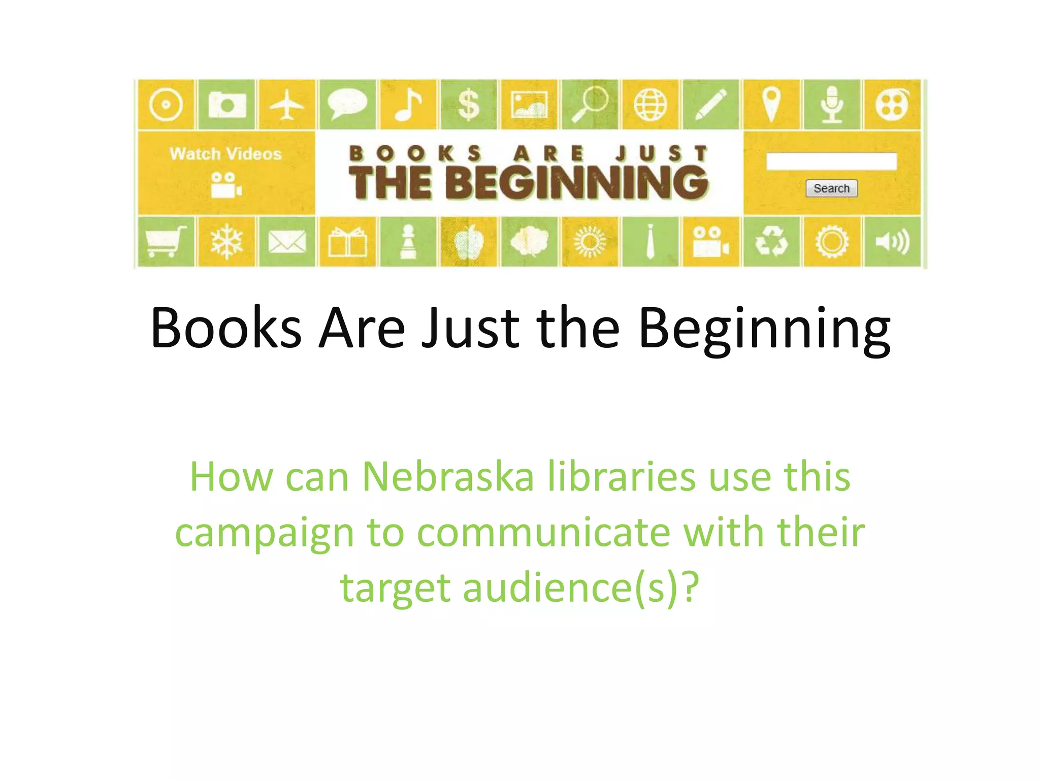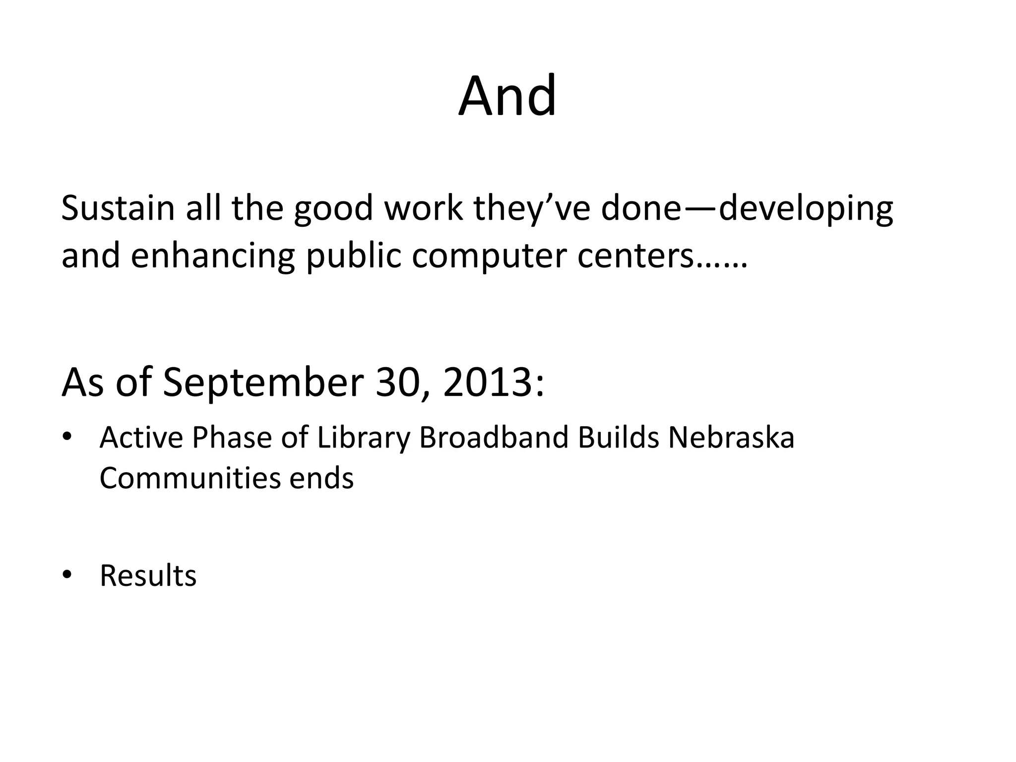 Nebraska libraries have successfully enhanced public computer centers through a broadband project, resulting in significant increases in the number of computers and users. Moving forward, the focus will be on sustainability, using effective communication strategies to promote the message that 'books are just the beginning.' Libraries are encouraged to customize marketing materials and engage with their communities to maintain and grow their programs.