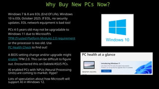 The document outlines essential information for purchasing computers for libraries, emphasizing the end-of-life status of various Windows operating systems and the need for upgrades to Windows 11 by October 2025. It covers different PC styles, components, and recommended software for public PCs while providing guidance on where to buy and funding sources for such purchases. Additionally, it highlights the importance of cybersecurity measures and offers assistance through the Nebraska Library Commission.