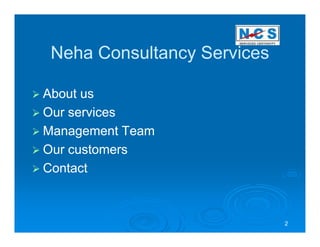 Neha Consultancy Services provides engineering and management consulting services with over 20 years of experience in India's power sector. They offer services including project management, energy management, metering projects, and distribution network upgrades. Their team of experienced engineers can prepare feasibility studies and detailed project reports. Notable past clients include several state utilities in Karnataka. Contact information is provided for Neha Consultancy Services in Bangalore.