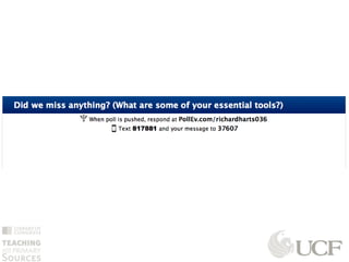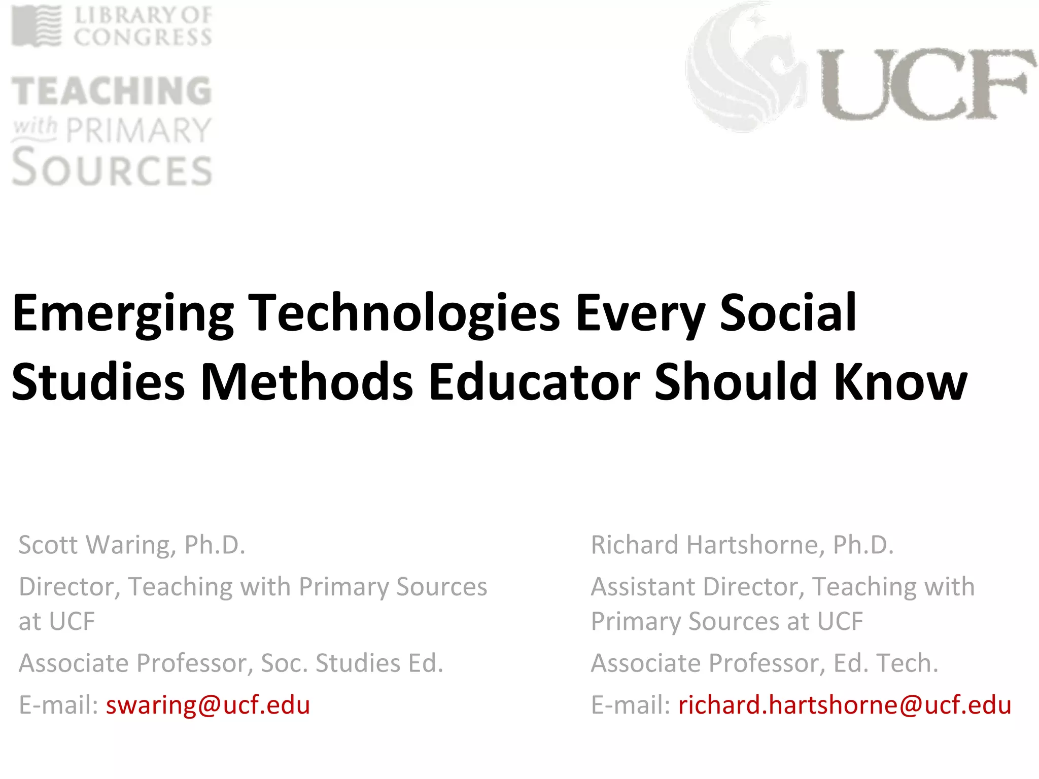 This document discusses emerging technologies that social studies educators should know about. It introduces Richard Hartshorne and Scott Waring, who will discuss tools that can help hook students, facilitate questioning, engage students with sources and resources, develop narratives and authentic assessment, and promote reflection. The presentation focuses on free and easy-to-use technologies in five areas that can enhance the social studies classroom.