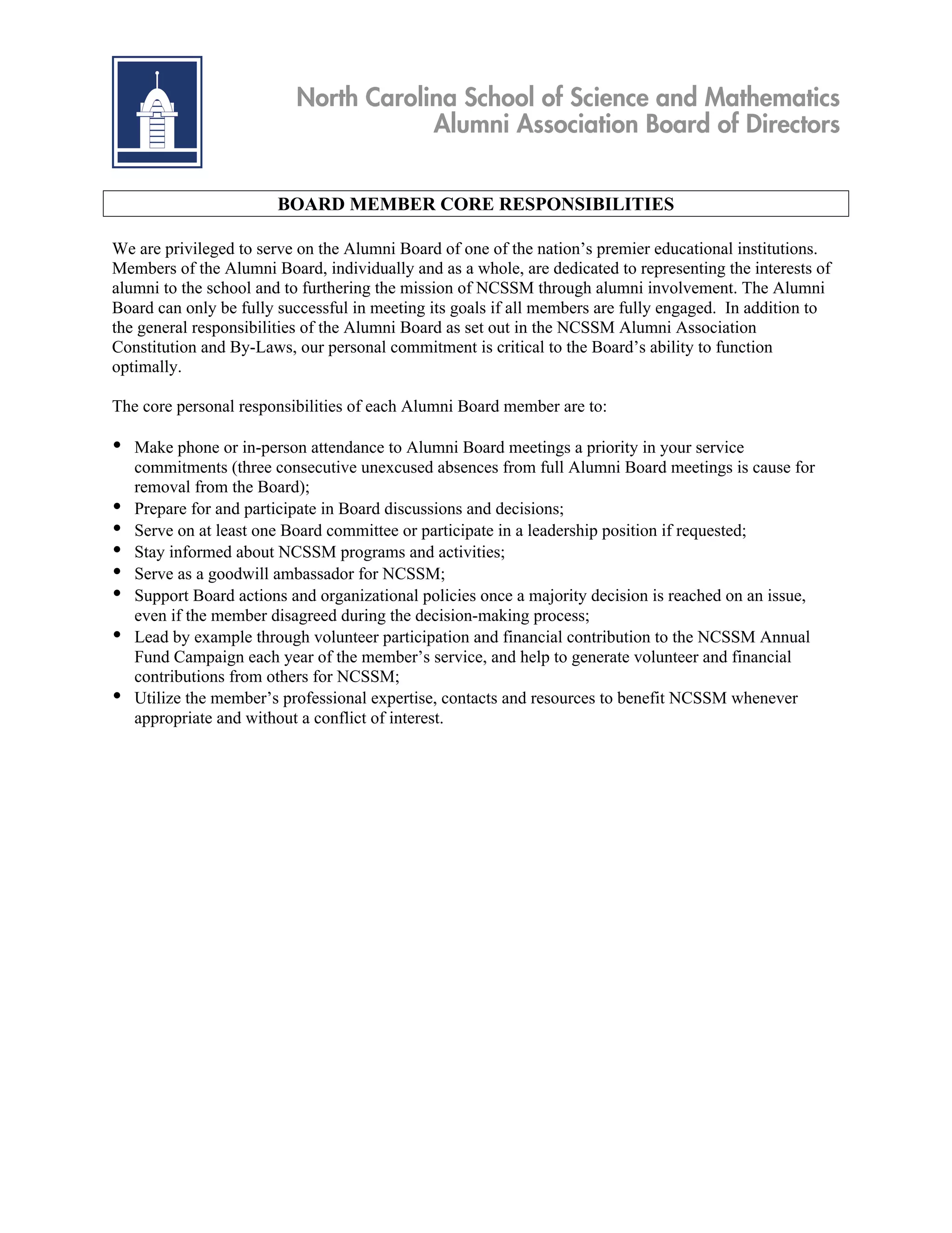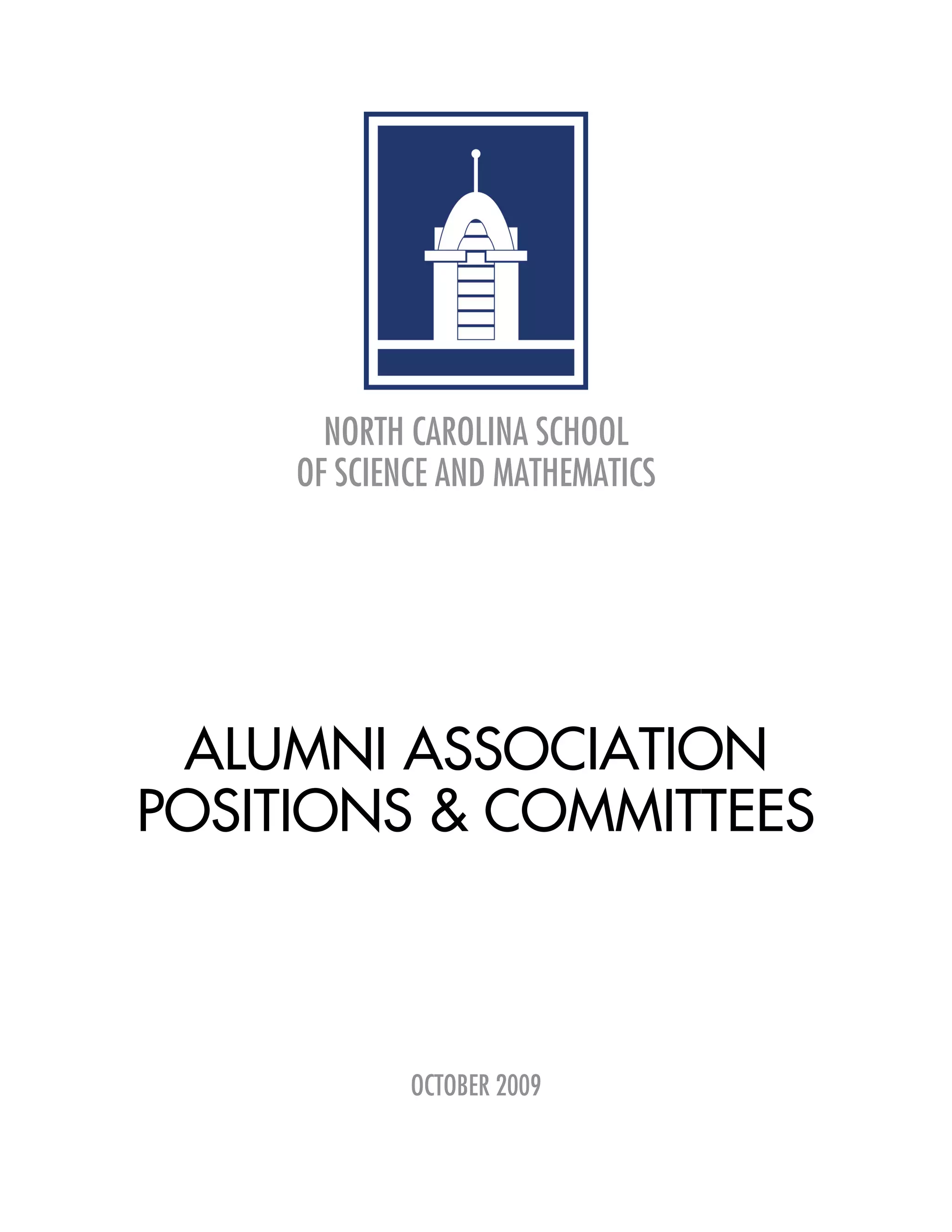 The document provides information about positions and committees for the North Carolina School of Science and Mathematics (NCSSM) Alumni Association board. It includes descriptions of the core responsibilities of board members and positions for the president, vice president, secretary, and treasurer. It also includes charters for several committees, including communications, fundraising, social, and volunteerism, which outline their purpose, responsibilities, and goals.